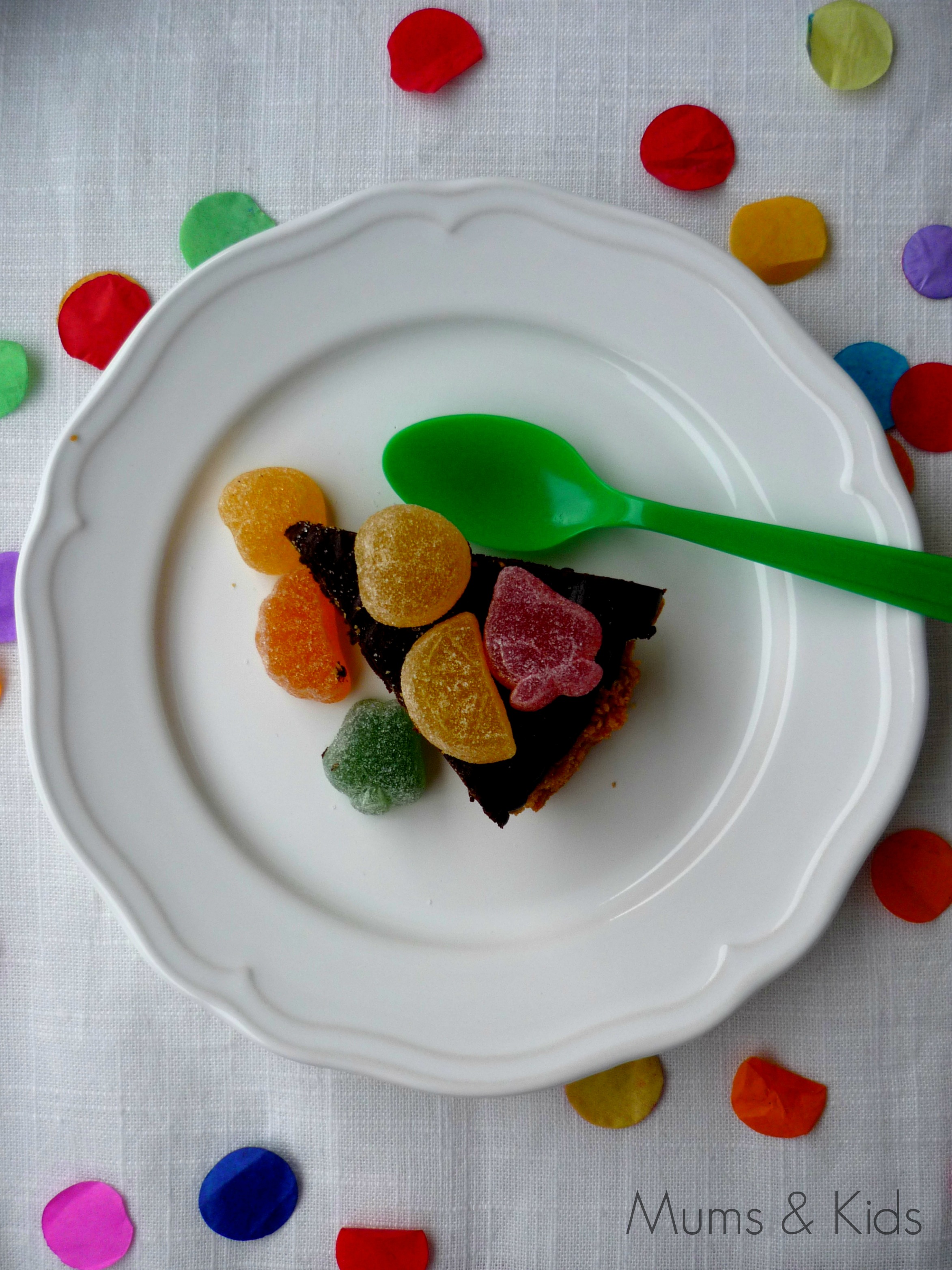 He hecho una combinación que creo que queda muy bien! Galletas María de base (la misma que utilicé en la receta de Cheesecake a la Naranja) que les encantan a los niños y chocolate negro de relleno (si preferis con leche también quedará genial!). Explosiva! O, como diría mi marido: «una bomba»!! Y para darle un toque más infantil, la decoramos con unos cuantas gominolas de fruta, chuches o lacasitos/ M&M y queda genial por encima!